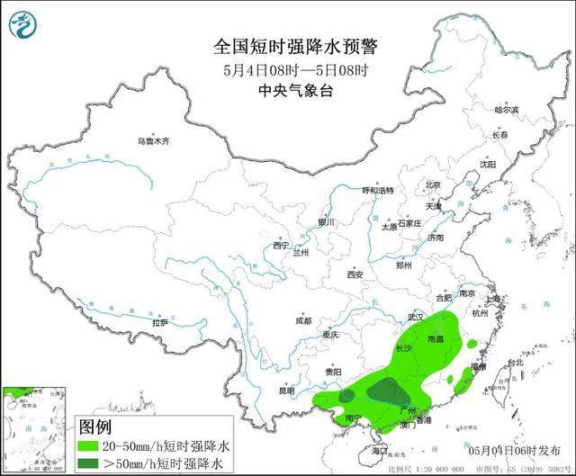预计5月4日08时至5日08时,江西中南部、广西中北部、广东中部和西部等地的部分地区将有8-10级雷暴大风或冰雹天气,其中广西中北部、广东中部等地的局地将有10级以上雷暴大风,最大风力可达11级;湖北东南部、安徽南部、湖南东部、江西、福建东南部和西北部、云南东南部、广西、广东中西部等地的部分地区将有小时雨量大于20毫米的短时强降水天气,其中广西中东部、广东西北部等地的局地最大小时雨量大于50毫米,最大可达70毫米以上。