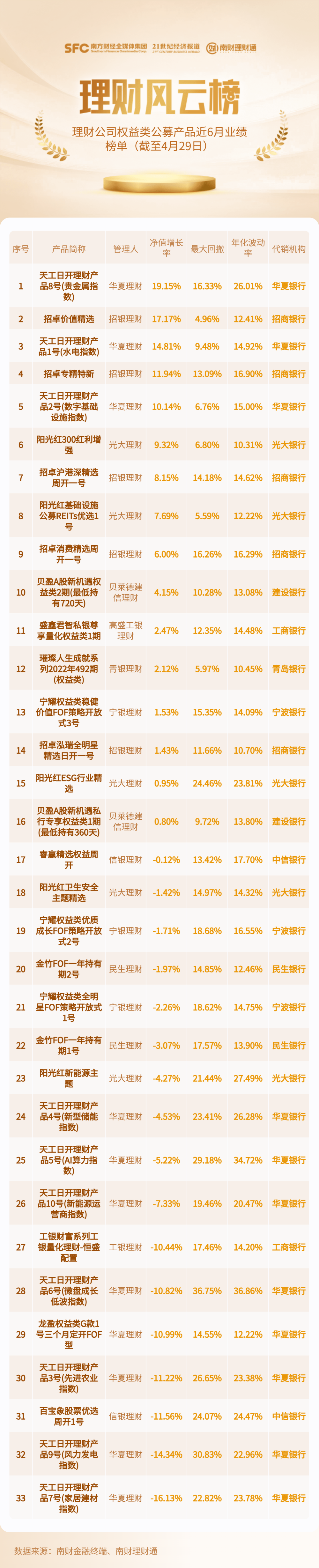 从权益类公募产品业绩表现看,33只权益类公募产品近6月算术平均净值增长率、最大回撤率和年化波动率分别是0.01%、16.61%和18.05%。其中,17只产品收益为负,华夏理财“天工日开理财产品8号(贵金属指数)”受益于商品涨价影响近6月净值增长率达19.15%,在榜单中排名第一位,招银理财重仓红利资产产品“招卓价值精选”排名第二位,近6月净值增长率为17.17%,同时其最大回撤水平在同类产品中表现最低,仅为4.96%,表现出较强的抗跌能力。此外,招银理财“专精特新”、华夏理财“天工日开理财产品1号(水电指数)”和“天工日开理财产品2号(数字基础设施指数)”三只产品同样涨超10%。不过,华夏理财指数产品表现分化,有四只产品在榜单中排名后五位,其中“天工日开理财产品7号(家居建材指数)”排名垫底,近6月净值下跌16.13%。