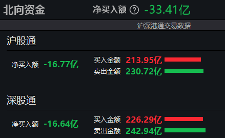 北向资金半日净卖出33.41亿元。其中,沪股通净卖出16.77亿元,深股通净卖出16.64亿元。