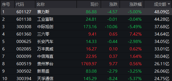 沪深两市半日成交额6276亿,较上个交易日同期缩量961亿。个股方面,赛力斯成交额48.09亿元居首,工业富联成交额同样超40亿元,中际旭创、三六零、长安汽车、万丰奥威、中信海直成交额均超30亿元。