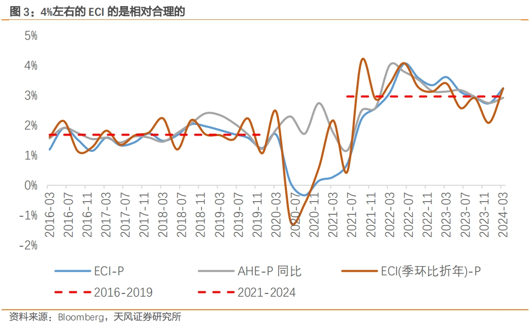 本周公布的ECI再次超出预期,4.2%的ECI增速对应了2.5%左右的通胀预期和1%以上的生产力增速;当前各口径下的工资增速反弹并维持在4%以上水平是支撑二次通胀的因素之一。