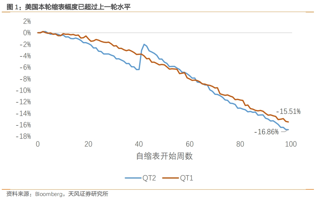 恰好本轮缩表周期(QT2)也进行到第99周,目前为止资产负债表下降了1.51万亿美元,降幅16.9%,已经超过上一次缩表时的降幅。