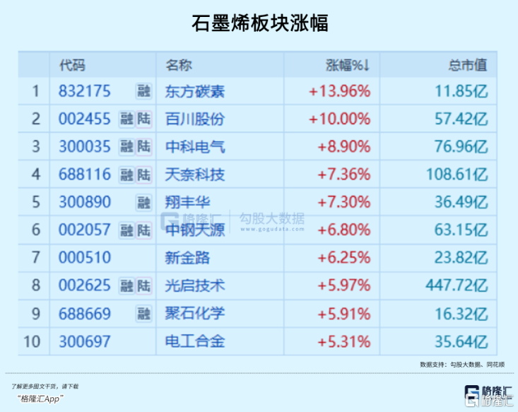 市场的反应迅速,石墨烯概念集体走高,东方碳素涨近14%,百川股份、中科电气涨超7%,尚太科技、翔丰华涨超5%。