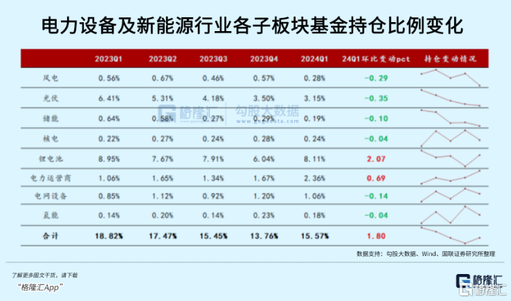 各子板块中,锂电池的持仓比例环比提升最大(+2.07%),其余子板块出现了环比减仓。