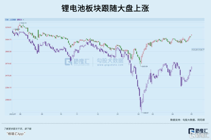 四月底锂电池板块跟随大盘普涨,随着二季度逐渐步入旺季,锂电基本面呈现边际好转的趋势。