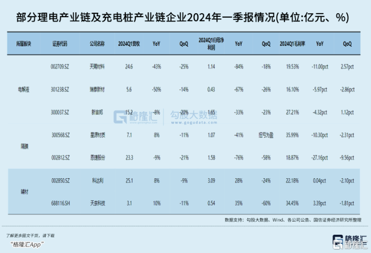 电解液去年四季度出现了较大的利润下滑,扣非单吨净利环比下降57%-67%,Q1受传统淡季的影响,平均出货量环比下降约20%-30%。隔膜产品仍在持续降价,Q1结构件的单位价值量环比下降约5%-10%,行业整体毛利率继续下滑。