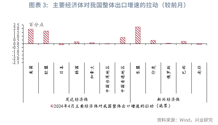 受益于全球需求改善及春节扰动消退,4月出口同比较前月上行9.0个百分点至1.5%,我国出口延续温和复苏态势。分产品看,机电产品和劳动密集型产品出口增速回升,为拉动我国出口增速回升的主要来源项。具体而言: