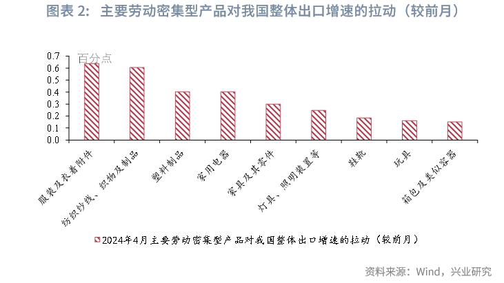 从劳动密集型产品看,伴随春节影响消退,以服装、家具、家电为代表的“老三样”出口增速回升。其中,4月服装及衣着附件、纺织纱线、塑料制品、家用电器、家具及其零件、灯具、鞋靴、玩具、箱包及类似产品等传统劳动密集型产品出口增速环比回升幅度均在10%以上,合计拉动我国出口增速较前月回升3.1个百分点。