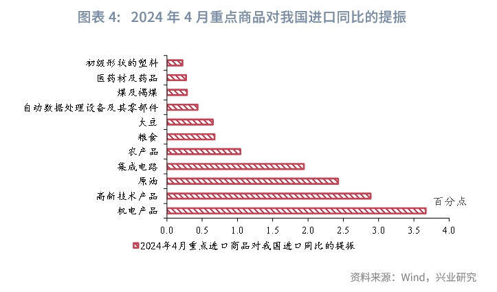 从出口需求回升看,出口复苏带动相关中间品进口需求回升。在全球产业链分工背景下,计算机电子产业链出口复苏带动相关中间品进口需求回升。尤其是对于计算机电子和汽车这类生产链条较长的产业而言,其出口需求复苏有助于带动集成电路和汽车零部件等相关中间品进口需求回升。结合我国进口产品看,4月集成电路和自动数据处理设备及其零部件进口同比分别较前月回升14.2和22.0个百分点,分别拉动整体进口增速较前月回升1.9和0.4个百分点。同时,汽车零件进口同比分别较前月回升16.9%至19.6%,带动整体进口增速较前月回升0.2个百分点。