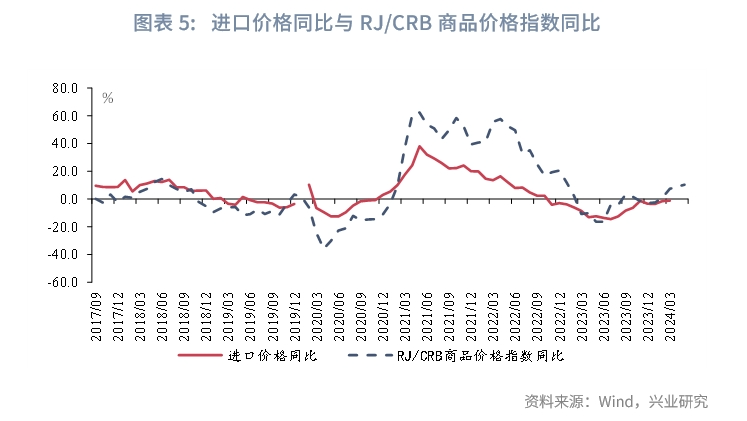 从大宗商品价格上升看,4月RJ/CRB商品价格指数同比升至8.8%,为2023年2月以来的最高值,有助于带动我国进口价格同比改善。以原油为代表,4月我国原油进口同比较前月回升18.4个百分点至15.0%,带动我国整体进口增速较前月回升2.4个百分点。量价分离来看,4月原油进口量价齐涨,进口数量和进口均价同比分别增长5.5%和8.2%。