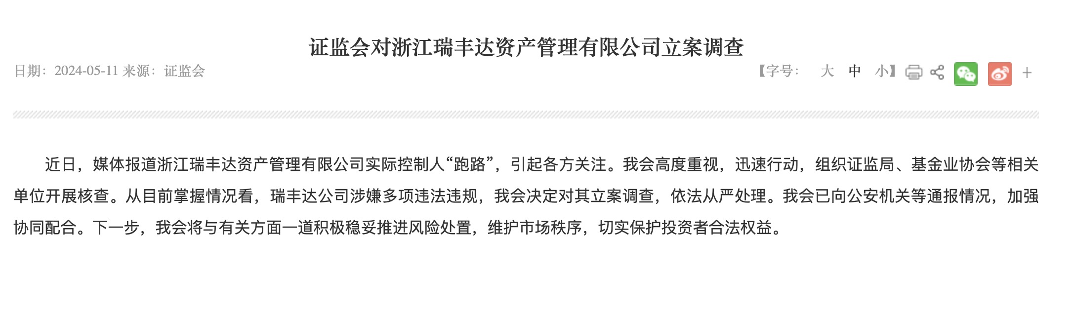 5月11日晚,证监会发布公告,对浙江瑞丰达资产管理有限公司(下称“瑞丰达资产”)立案调查。