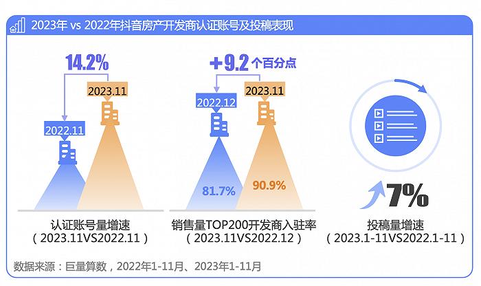 不过根据《2024抖音房产生态白皮书》的数据显示,抖音入局房地产以来,目前直播已经成为行业常态化经营方式之一。2023年抖音房产开发商认证账号、投稿量双增,截至2023年11月,销售量TOP200的开发商入驻率提升至90.9%,比2022年入驻率高出9.2%。