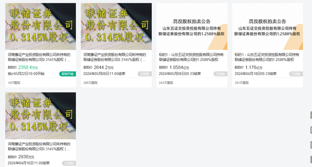 中拍平台显示,上述两笔股权在近一个月已分别开展了两次公开拍卖,起拍价一降再降,但均接连流拍。4月16日、18日,联储证券0.31%和1.26%股权分别开启第一次拍卖,起拍价为2938万元和1.176亿元,流拍;5月8日,上述两笔股权开启第二次拍卖,起拍价为2644.2万元和1.0584亿元,流拍。