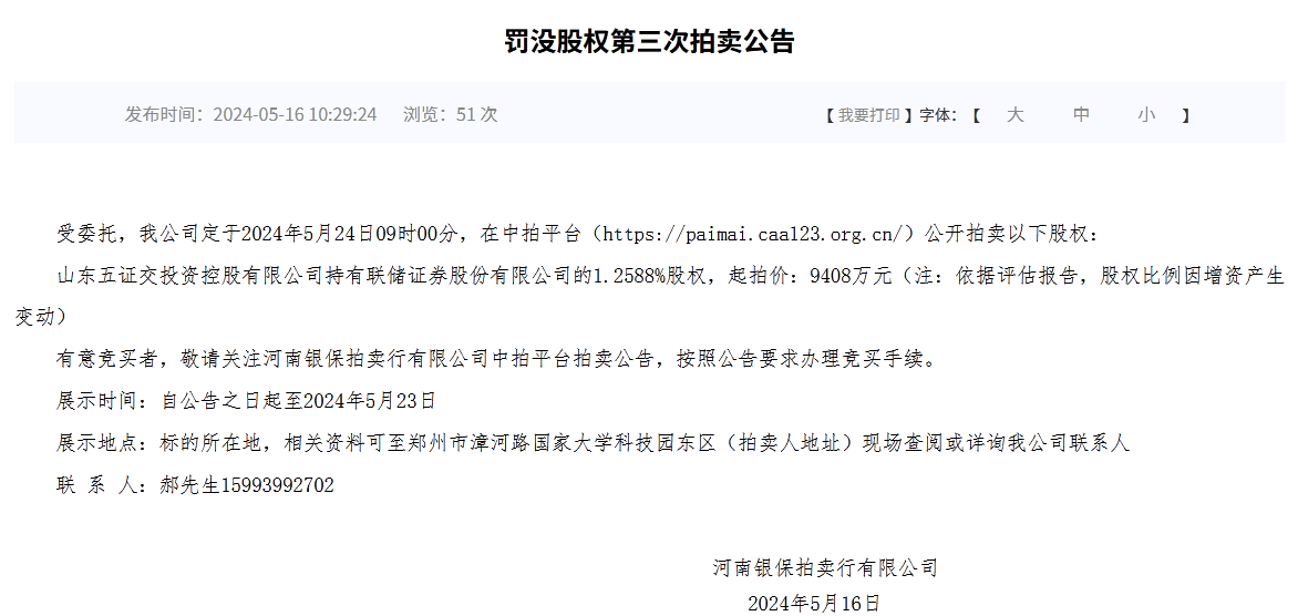 5月16日,河南省公共资源交易中心发布最新拍卖公告,联储证券约1.26%的股权将于本月24日拍卖,起拍价约为9408万元。
