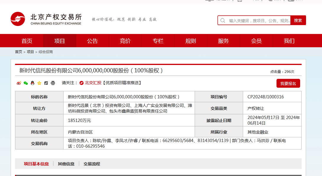 5月16日,北京产权交易所挂出新时代信托60亿股股份(100%股权)转让公告,转让底价为18.51亿元,披露起止日期为5月17日至6月14日。