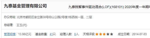 记者查阅天天基金网发现,九泰基金管理规模仅为13.98亿元,而徐进此前所在的国融基金和嘉合基金的管理规模分别为36.42亿元、418.19亿元。