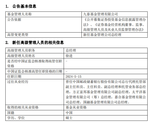 5月16日,九泰基金发布高管变更公告,徐进担任公司总经理,常务副总经理王玉不再代为履行总经理职务。