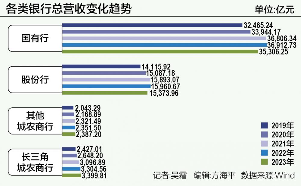 不过,南财记者发现,不同类别的银行表现分化明显。国有大行和股份行营收下滑明显,而城商行和农商行表现较优。具体来看,国有行和股份行的营收总额分别相较2022年下降了4.35%和3.68%;城商行和农商行则是分别增加了2.54%和1.27%。
