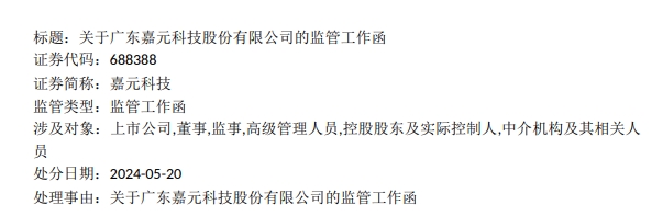 消息面上,嘉元科技于2024年5月20日收到监管工作函。该函涉及上市公司、董事、监事、高级管理人员、控股股东及实际控制人、中介机构及其相关人员。