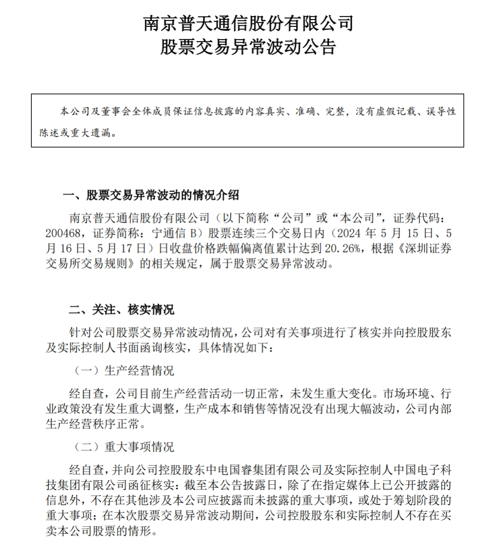 5月19日晚间,宁通信B也发布股价异动公告称,经自查,公司目前生产经营活动一切正常,未发生重大变化。市场环境、行业政策没有发生重大调整,生产成本和销售等情况没有出现大幅波动,公司内部生产经营秩序正常。