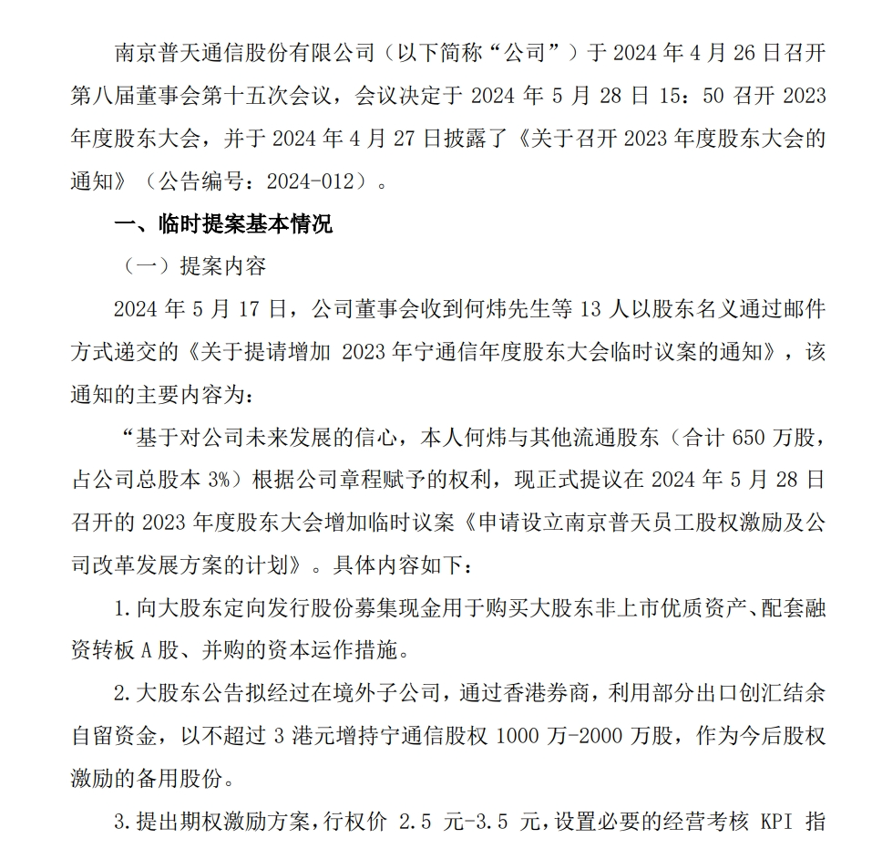 宁通信B5月19日的公告显示,5月17日,公司董事会收到何炜等13人以股东名义递交的《关于提请增加2023年宁通信年度股东大会临时议案的通知》。