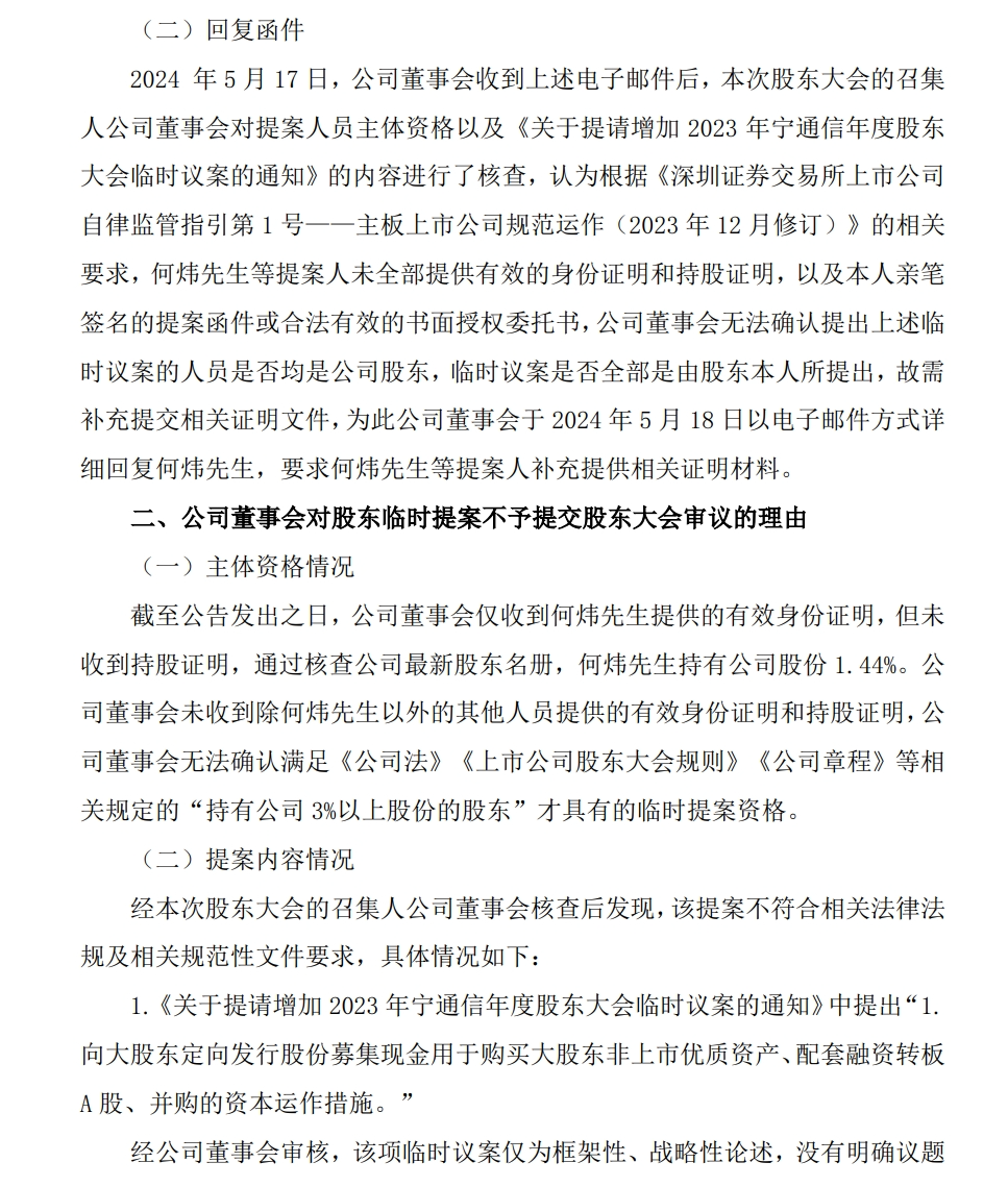 宁通信B19日称,董事会收到上述电子邮件后,本次股东大会的召集人公司董事会对提案人员主体资格以及相关内容进行了核查,认为根据相关要求,何炜等提案人未全部提供有效的身份证明和持股证明,以及本人亲笔签名的提案函件或合法有效的书面授权委托书,公司董事会无法确认提出上述临时议案的人员是否均是公司股东,临时议案是否全部是由股东本人所提出,故需补充提交相关证明文件,为此公司董事会于2024年5月18日以电子邮件方式详细回复何炜,要求何炜等提案人补充提供相关证明材料。
