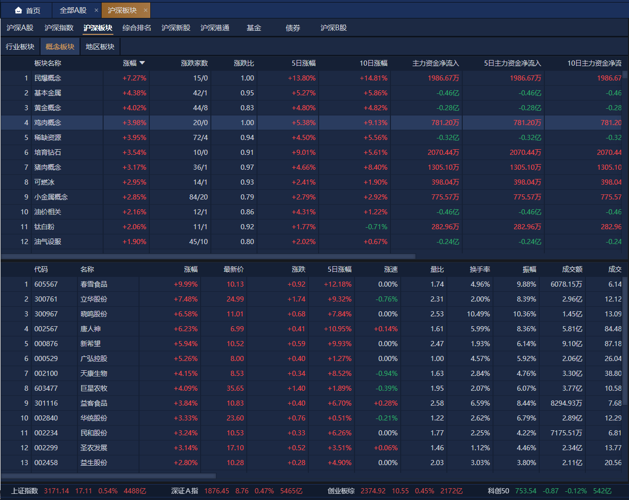 5月20日,猪肉鸡肉概念共振双双上涨,南财金融终端显示,鸡肉概念板块截至收盘板块上涨3.98%,春雪食品涨停,立华股份、晓鸣股份、唐人神、信息网、广弘控股涨超5%。