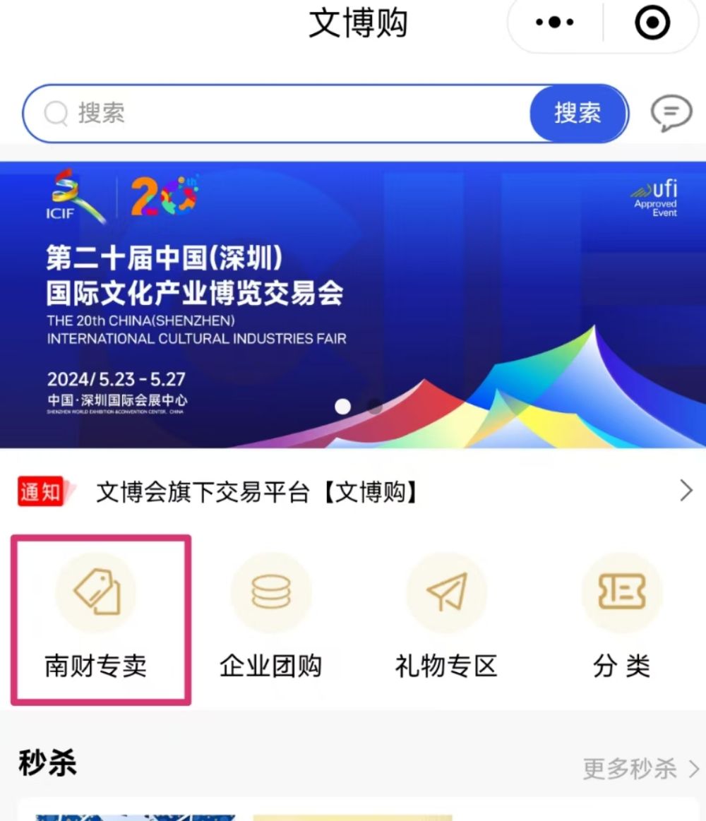 路径2:微信搜索“文博购”小程序,进入后点击首页“南财专卖”