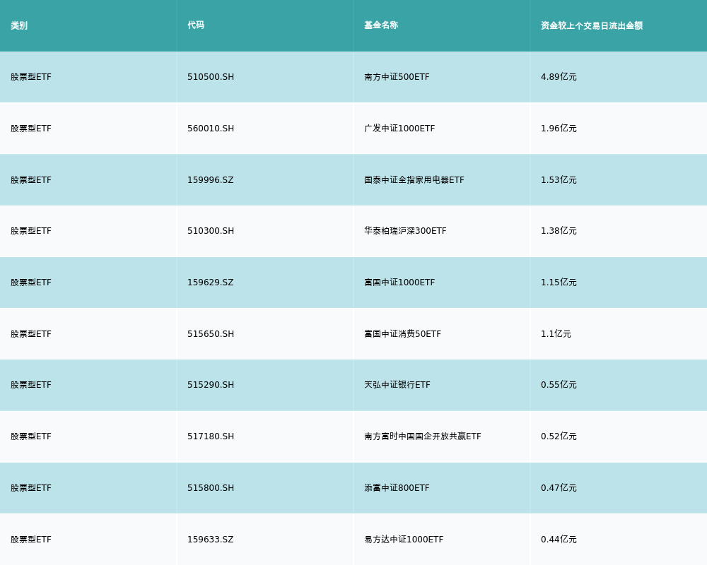 昨日股票型ETF资金流出最多的3支ETF及其流入金额分别为:南方中证500ETF(流出4.89亿元)、广发中证1000ETF(流出1.96亿元)、国泰中证全指家用电器ETF(流出1.53亿元)。资金流出前10详情见下表: