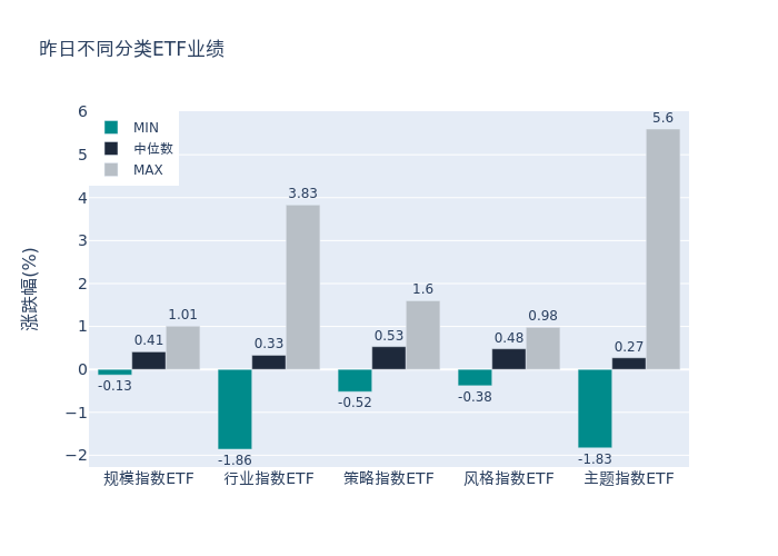 昨日股票型ETF收益率中位数为0.35%。其中按照不同分类,规模指数中500指增收益率最高,为1.01%;行业指数中有色50收益率最高,为3.83%;策略指数中国泰上证国有企业红利ETF收益率最高,为1.6%;风格指数中鹏扬中证500质量成长ETF收益率最高,为0.98%;主题指数中黄金股ETF收益率最高,为5.6%。