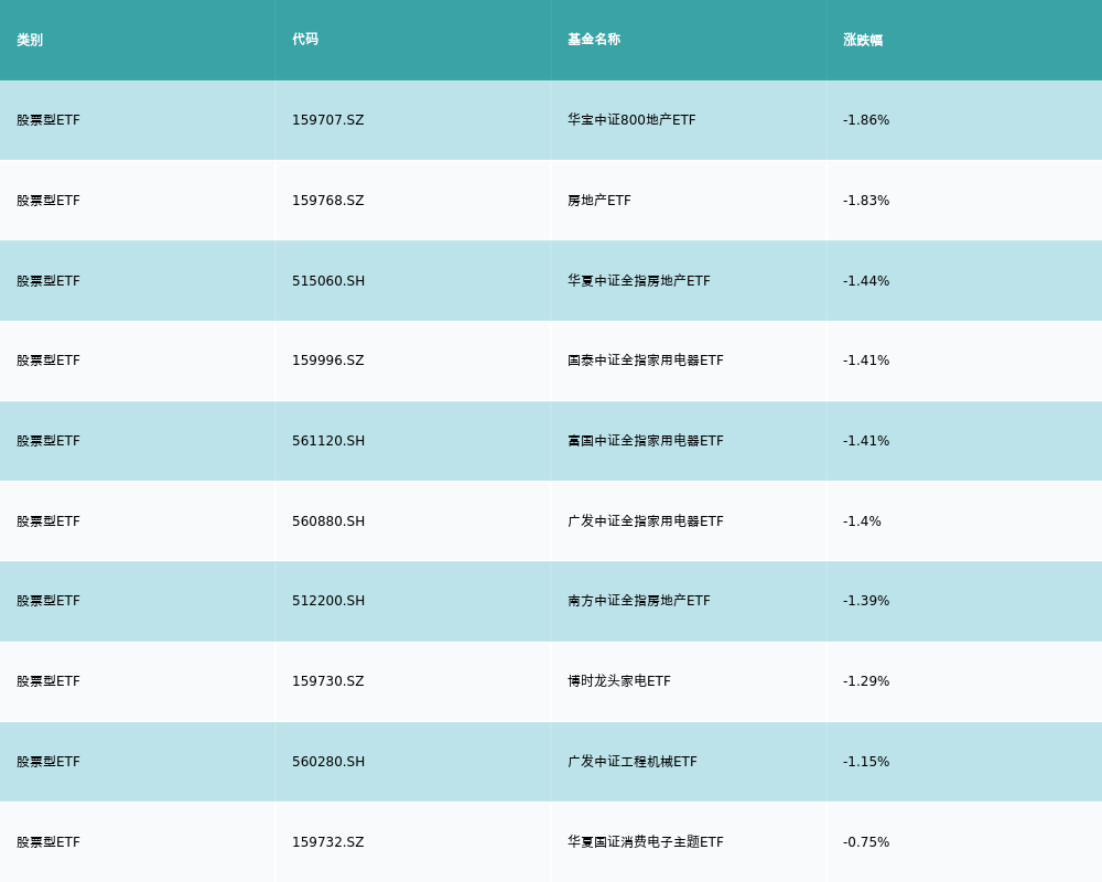 昨日股票型ETF跌幅最大的3支ETF及其收益率分别为:华宝中证800地产ETF(-1.86%)、房地产ETF(-1.83%)、华夏中证全指房地产ETF(-1.44%)。跌幅前10详情见下表: