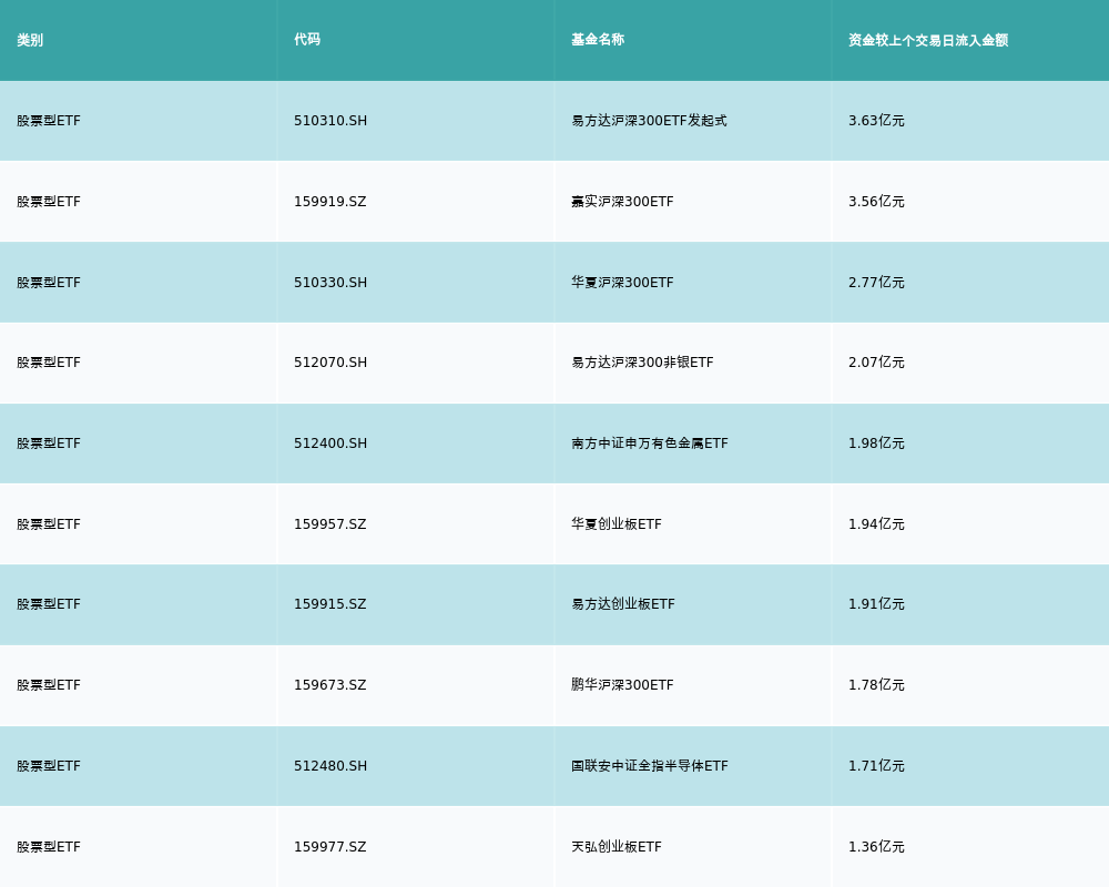 昨日股票型ETF资金流入最多的3支ETF及其流入金额分别为:易方达沪深300ETF发起式(流入3.63亿元)、嘉实沪深300ETF(流入3.56亿元)、华夏沪深300ETF(流入2.77亿元)。资金流入前10详情见下表: