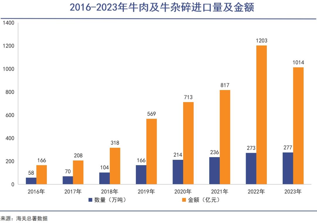 根据海关总署数据显示,我国正在逐渐加大对牛肉的进口力度。2016年,牛肉及牛杂碎进口数量仅58万吨,到2023年已经达到277万吨,增幅377.58%。进口金额也从百亿元,飞跃至千亿元水平。