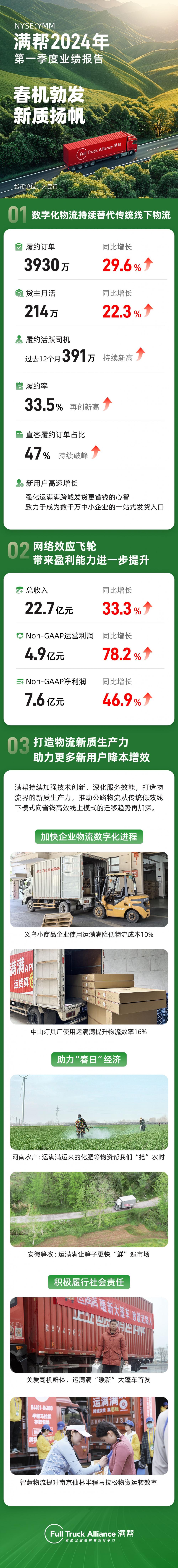5月21日,数字货运平台满帮集团(YMM.US)于美股盘前发布了2024年第一季度财报。数据显示,满帮本季度各项关键运营指标获得持续提升,履约率、直客履约订单占比等数字再创历史新高,平台对于司机货主双端创造的价值得到进一步验证。