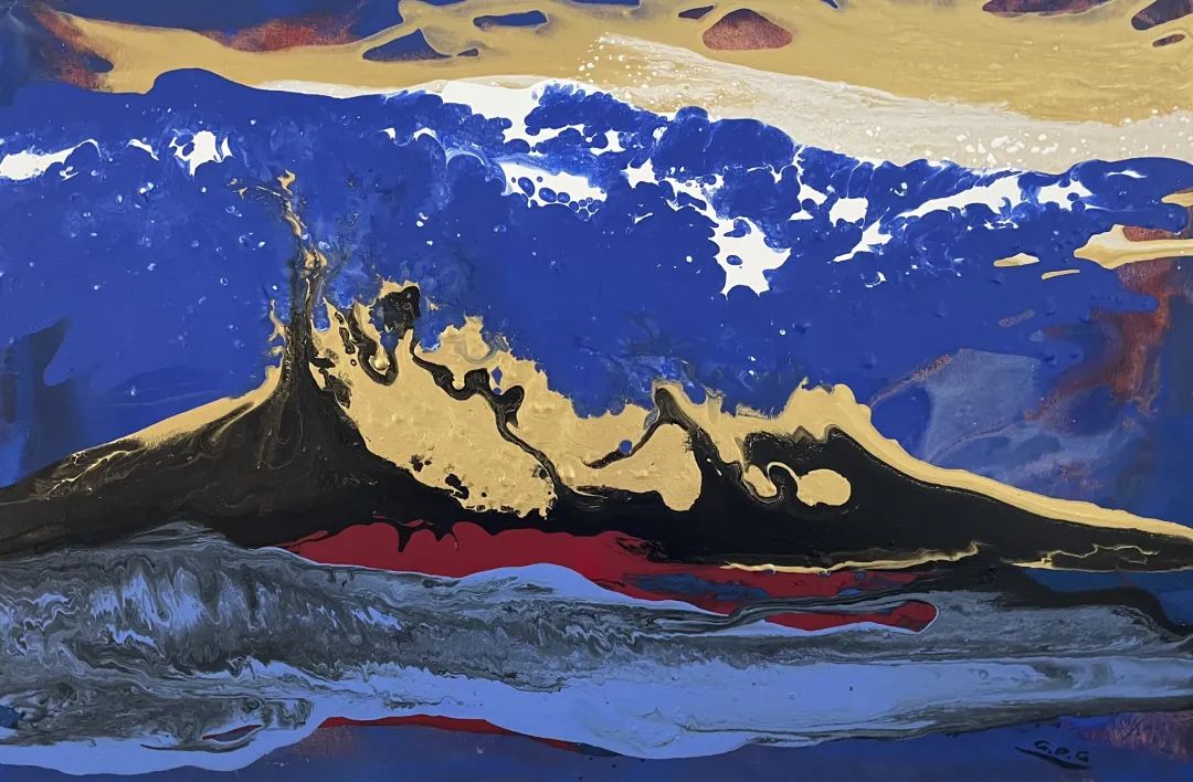 在画面的构图上,高大钢采用了大胆的视角和构图方式。他将江海置于画面的中心位置,通过强烈的色彩对比和飘色的流动感,突出了江海的主体地位。同时,他还巧妙地运用了一些细节元素,如金色飞溅的浪花、翻滚的云层、红与黑的波涛等,进一步增强了画面的动感和冲击力。