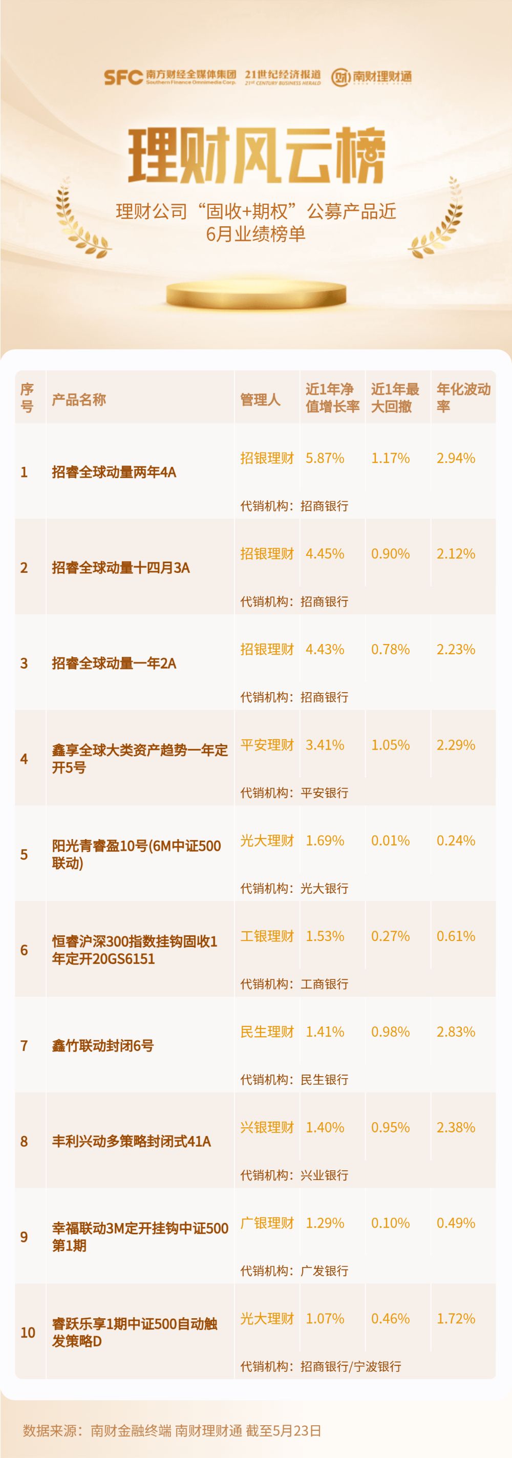 在理财公司“固收+期权”公募产品近6月业绩榜单中,7家理财公司产品上榜。其中,招银理财上榜3只产品,光大理财上榜2只产品,平安理财、工银理财、民生理财、兴银理财和广银理财各有1只产品上榜。