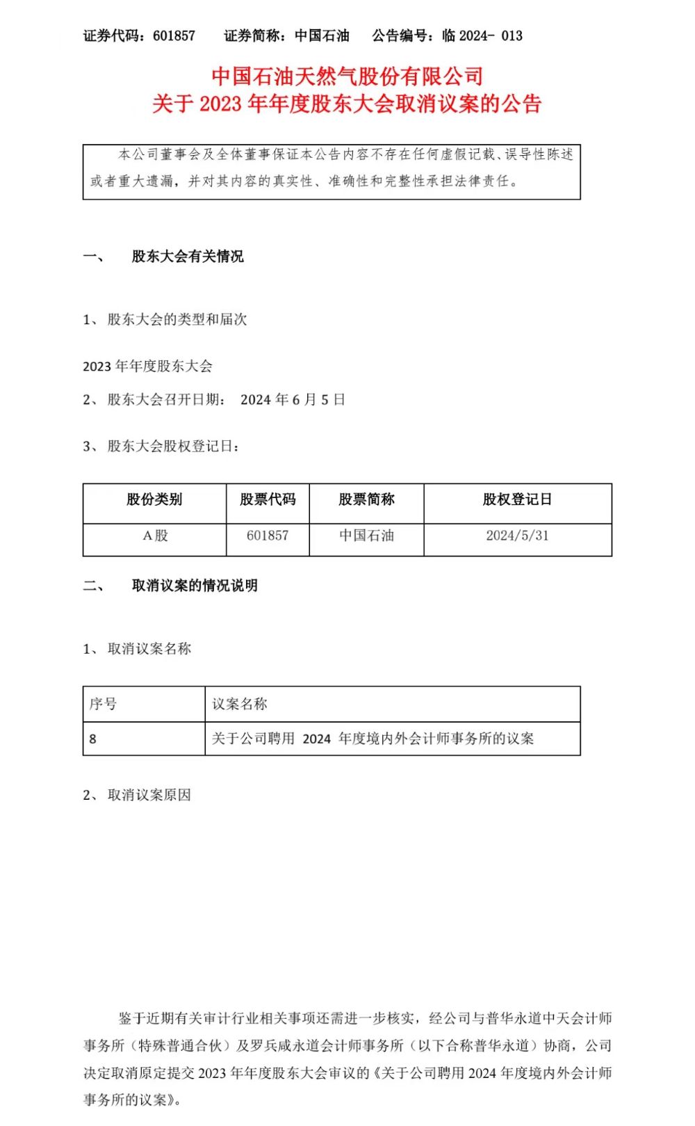 5月30日,中国石油发布公告称,鉴于近期有关审计行业相关事项还需进一步核实,经公司与普华永道中天会计师事务所(特殊普通合伙)及罗兵咸永道会计师事务所(以下合称普华永道)协商,公司决定取消原定提交2023年年度股东大会审议的《关于公司聘用2024年度境内外会计师事务所的议案》。