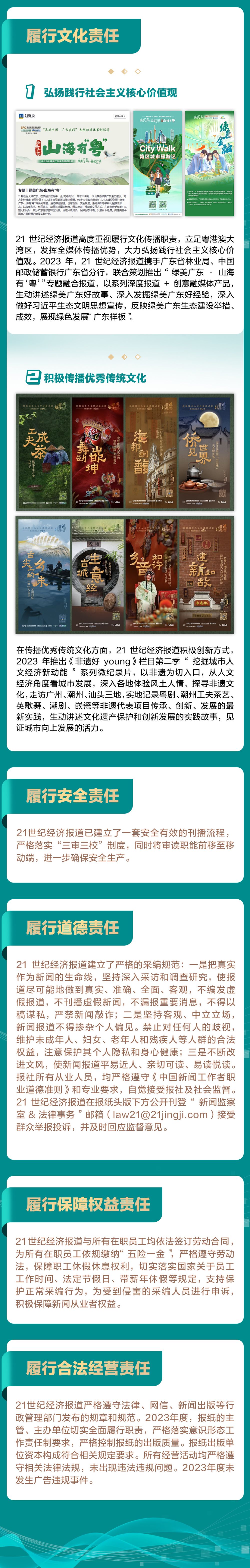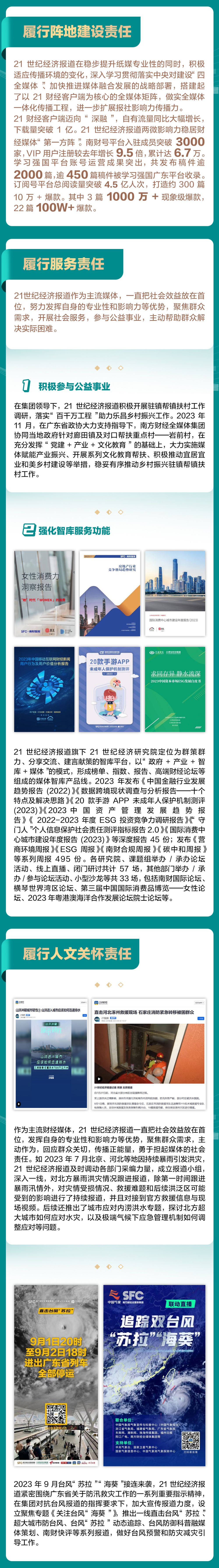 21世纪经济报道作为主流财经媒体,一直把社会效益放在首位,努力发挥自身的专业性和影响力等优势,聚焦群众需求,传播正能量,勇于担起媒体的社会责任。