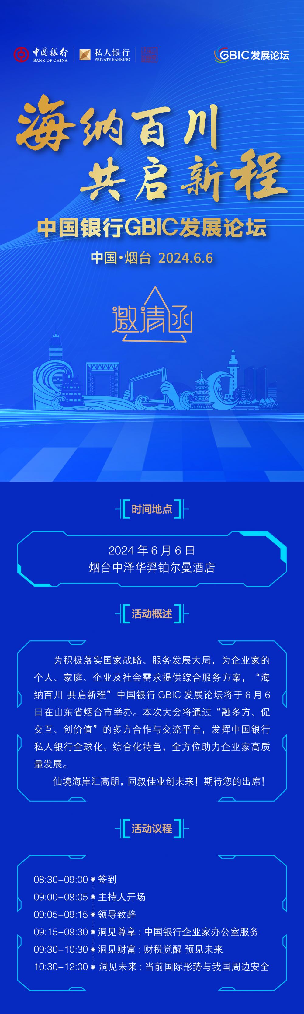 为积极落实国家战略、服务发展大局,为企业家的个人、家庭、企业及社会需求提供综合服务方案,“海纳百川 共启新程”中国银行GBIC发展论坛在山东省烟台市举办。本次大会将通过“融多方、促交互、创价值”的多方合作与交流平台,发挥中国银行私人银行全球化、综合化特色,全方位助力企业家高质量发展。