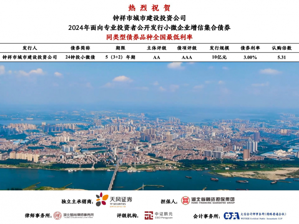 4月2日,天风证券作为独立主承销商的钟祥市城市建设投资公司(以下简称“钟祥城投”、“发行人”)2024年面向专业投资者公开发行小微企业增信集合债券(以下简称“本期债券”)成功发行,募集资金总额10.00亿元,期限为5年期,利率3.00%,为同类型债券品种全国最低利率。据了解,本期债券为证监会核发注册的首批企业债,也是证监会债券新规《公司债券发行与交易管理办法》发布后,湖北省首只成功发行的地方国企平台企业债券。