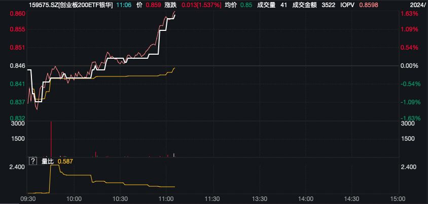 相关ETF方面,创业板200ETF(159575)盘中翻红,截至发稿涨1.54%,换手率为0.76%。