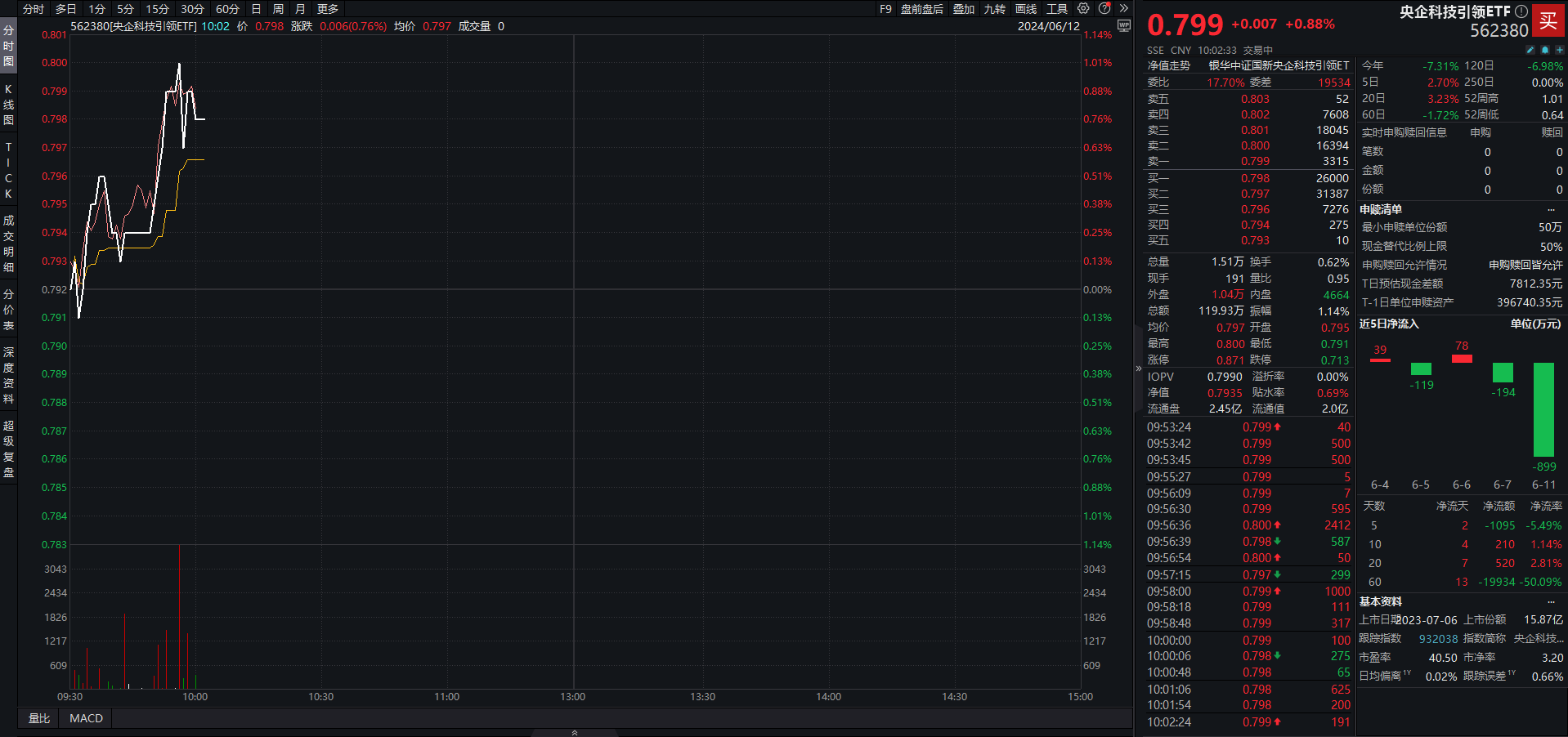 相关ETF中,央企科技引领ETF(562380)盘中拉升涨0.88%,当前成交额近120万元,换手率为0.62%。