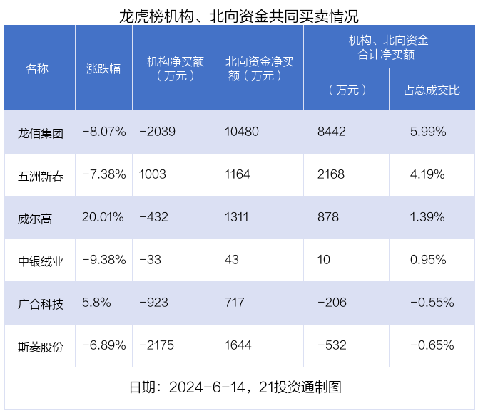 值得注意的是,机构和北向资金共同净买入了五洲新春;在龙佰集团,斯菱股份,威尔高,广合科技,中银绒业上出现分歧,机构净卖出龙佰集团2038.6万元,北向资金净买入1.05亿元;机构净卖出斯菱股份2175.17万元,北向资金净买入1643.66万元;机构净卖出威尔高432.28万元,北向资金净买入1310.5万元;机构净卖出广合科技923.25万元,北向资金净买入716.86万元;机构净卖出中银绒业33.41万元,北向资金净买入43.07万元。