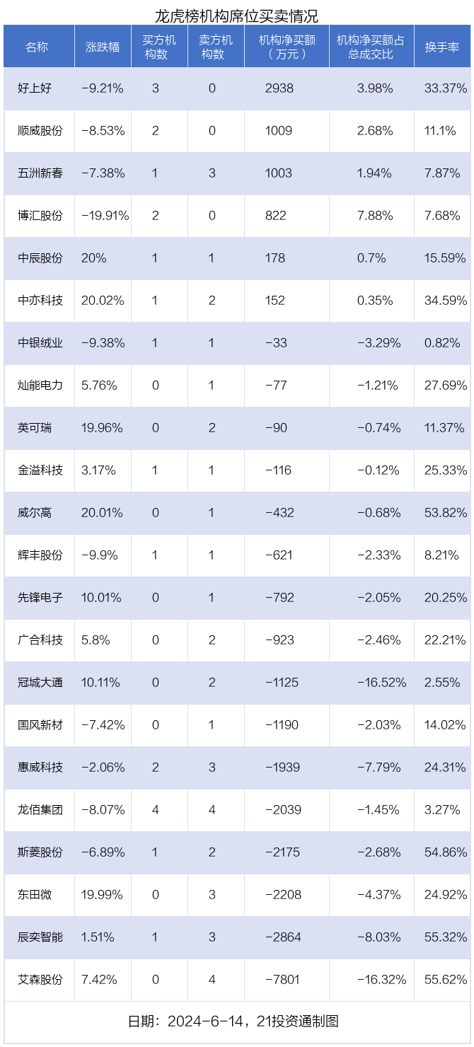其中,机构净买入金额最多的是好上好(001298.SZ),当日收盘下跌9.21%,换手率为33.37%。