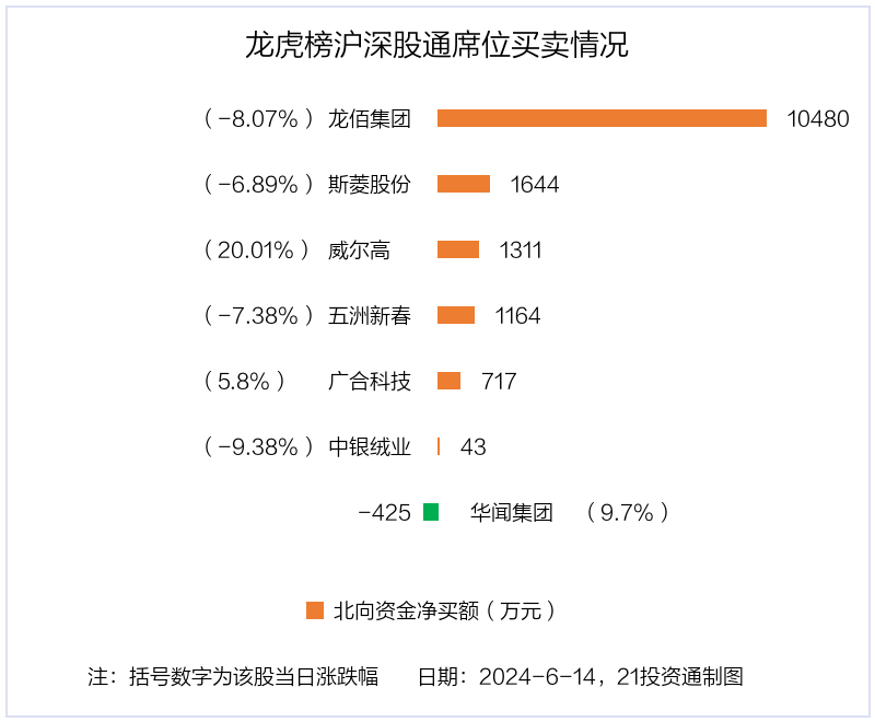 6月14日,北向资金参与龙虎榜中的个股共有7只,合计净买入1.49亿元。其中沪股通净买入1 股,合计净买入1164.38万元;深股通净买入5 股,净卖出1 股,合计净买入1.38亿元。