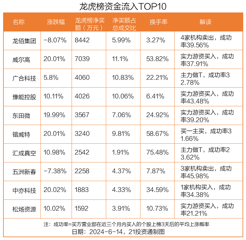 6月14日,上证指数上涨0.12%,深证成指上涨0.5%,创业板指上涨0.76%。盘后龙虎榜数据显示,共有59只个股因当日异动登上龙虎榜,资金净流入最多的是龙佰集团(002601.SZ),达0.84亿元。
