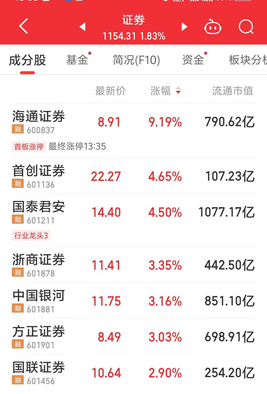 6月14日,券商板块午后快速拉升,海通证券一度触及涨停。截至13点53分,海通证券涨9.19%,首创证券涨4.65%,国泰君安涨4.5%,浙商证券、中国银河等跟涨。消息面上,近日市场传言国泰君安与海通证券将合并。