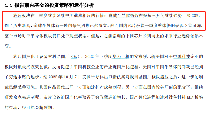 当前的市场位置半导体国产化板块经过连续几年的高速增长,估值已经到了合理区间,吐槽归吐槽,但基金经理还是坚定看好半导体国产化,其表示中国科技一定能全面突破美国的封锁,在此过程中半导体国产化板块的增长将保持中长期较高的增速,而目前股价却受市场情绪压制在相对低位,股价与基本面之间剪刀差较大,目前投资性价比较高。甚至在季报中喊出“黎明即将到来”的口号稳住投资人信心,可见基金经理对自身判断的信心。展望后市,基金君认为近期即将召开的高层会议或将进一步催化“科特估”行情,诺安优化配置A满满的半导体设备持仓有望在本轮半导体“科特估”行情中收获高额净值回报。