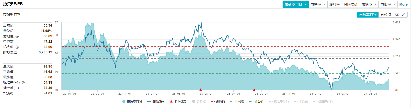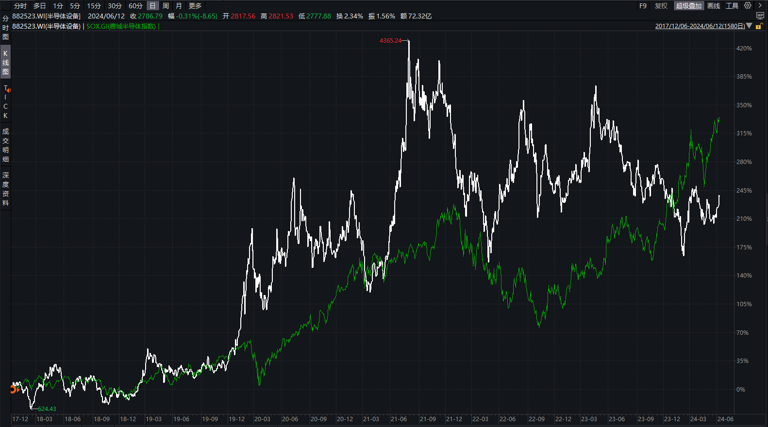 目前来看,A股半导体板块的颓势存在边际改善的预期,大基金三期落地的消息有望催化A股半导体板块跟上周期节奏补涨,从大基金消息落地计算,中证半导指数区间累计反弹超13%,部分机构更是将半导体行情延伸至“科特估”,与去年以来持续火爆的“中特估”行情相对应。“科特估”即新质生产力的升级,指优势制造+中国自造+先进智造。从市场表现上解释,“科特估”与“中特估”相同,并非平地拔估值,而是修复相对国际水平而言偏低的估值。从绝对水平上来看,相比于海外而言,代表先进制造的半导体设备板块相对低估,整个板块跌足了3年,现阶段有强烈的“拔估值”诉求以及国产化诉求。