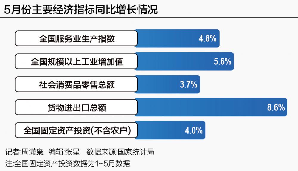 5月份,在宏观政策效应持续释放、外需有所改善、“五一”假期等因素带动下,服务业、消费和进出口都有所回升,工业生产保持较快增长,就业、物价形势稳定,转型升级持续推进,国民经济延续回升向好态势,运行总体平稳。但也要看到,当前外部环境复杂严峻,国内有效需求依然不足,经济持续回升向好仍面临诸多困难挑战。